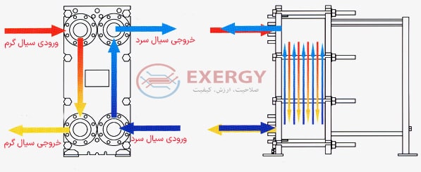- جریان متضاد در مبدلهای حرارتی صفحهای با چیدمان صفحات بهمنظور امکان حرکت جریانهای سیال در جهت مخالف به دست میآید. این کار راندمان انتقال حرارت را به حداکثر میرساند و اغلب در برنامههایی که فشردگی و عملکرد بالا ضروری است ترجیح داده میشود.